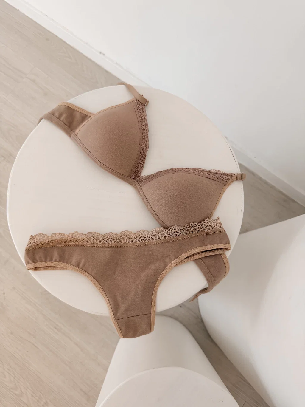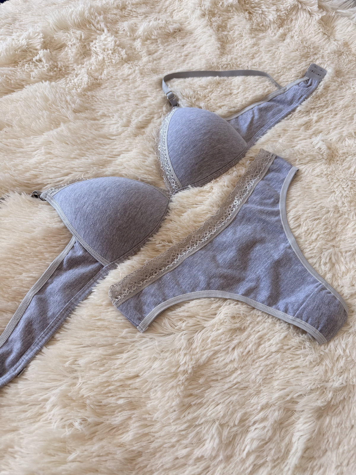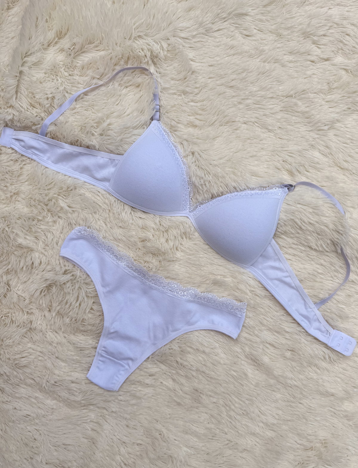 Conjunto de ropa interior de algodón con corpiño taza soft y bombi colaless completa, con detalles de puntilla.