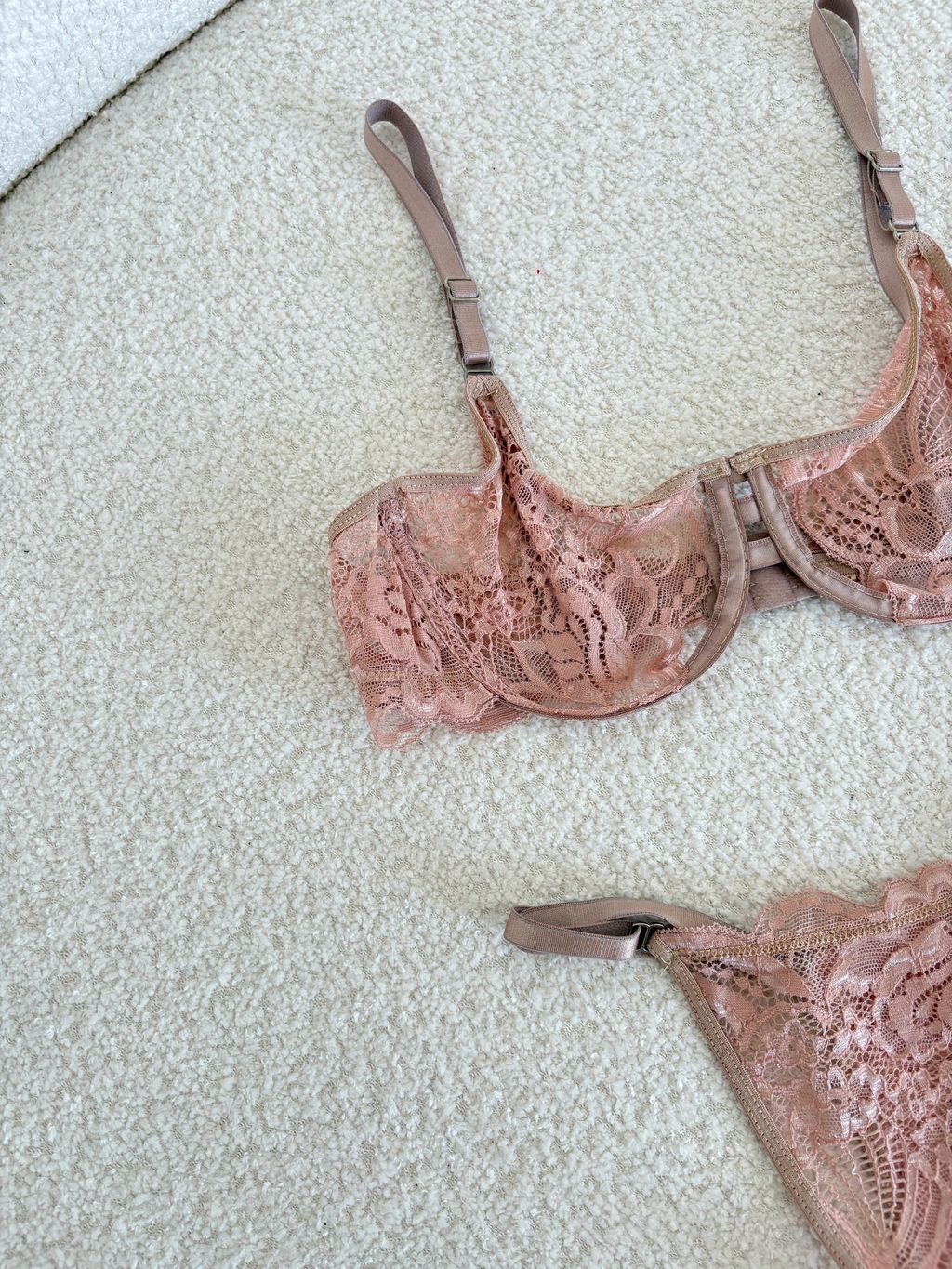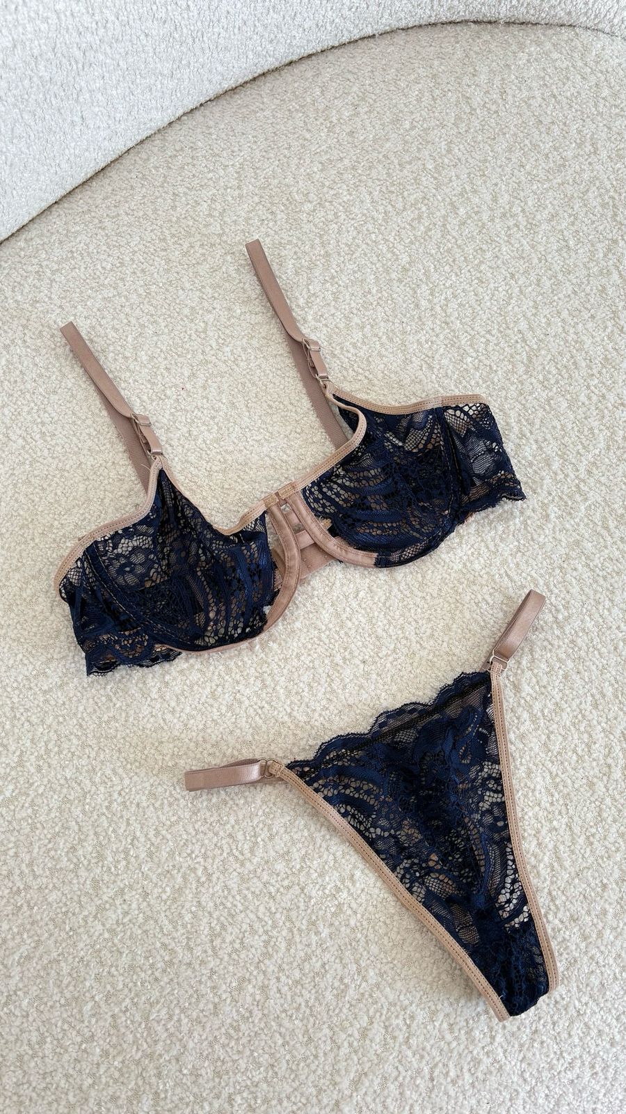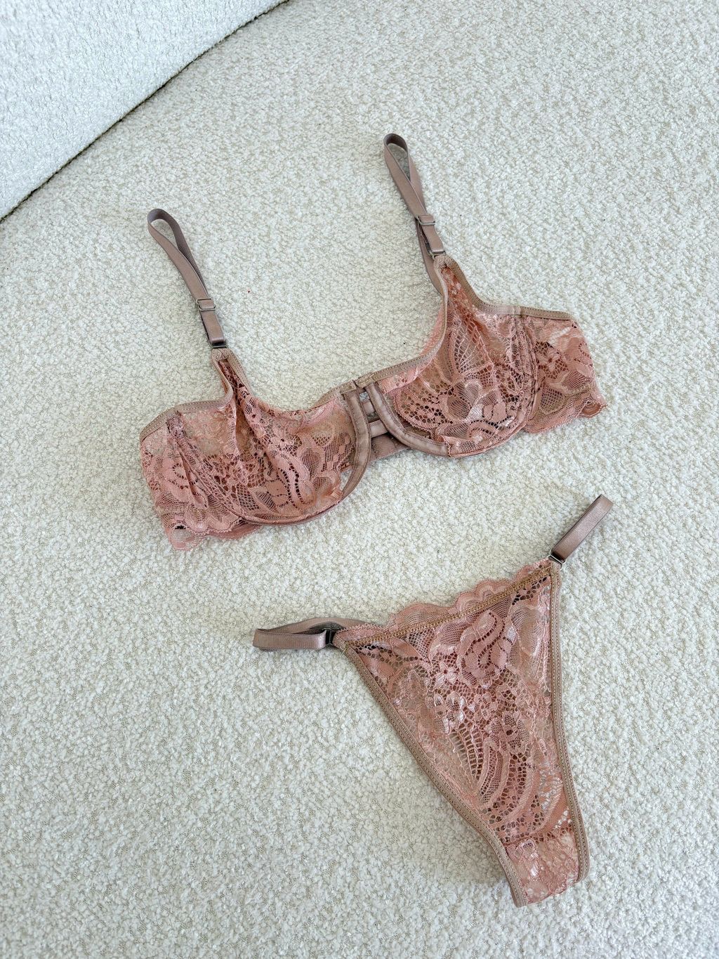 Conjunto de ropa interior lencero de encaje, corpiño con arco y bombi colaless regulable.