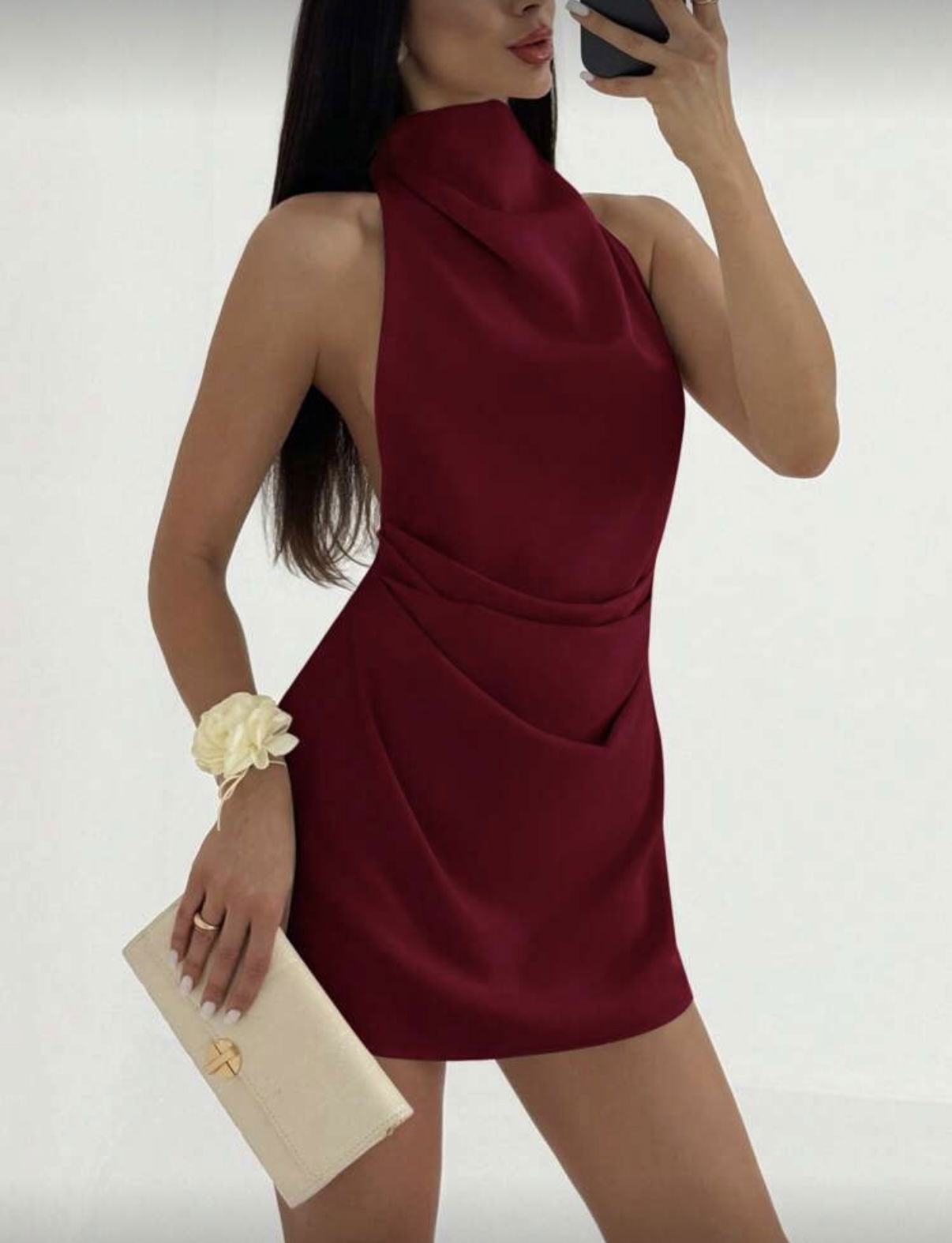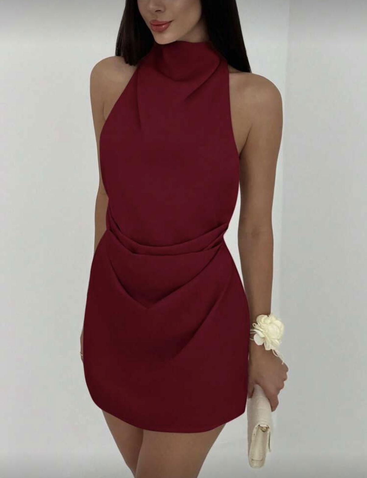 Vestido de tela sastrera super elegante, semi elastizado. Tiene espalda descubierta, ajusta la cintura y tiene cuello alto que se ata sobre la nuca.