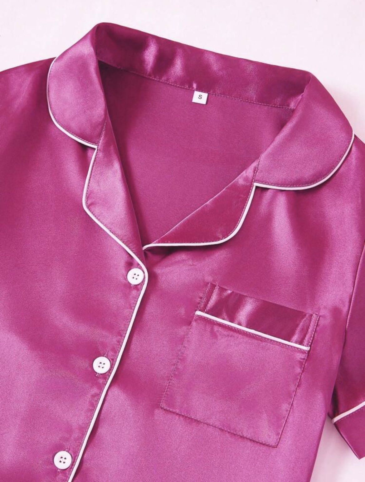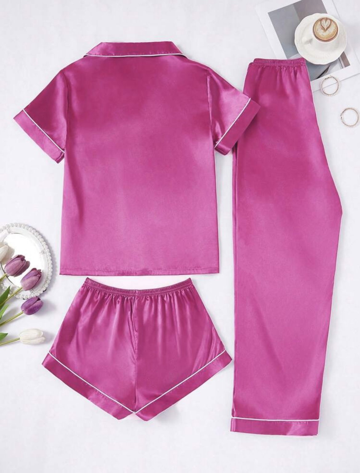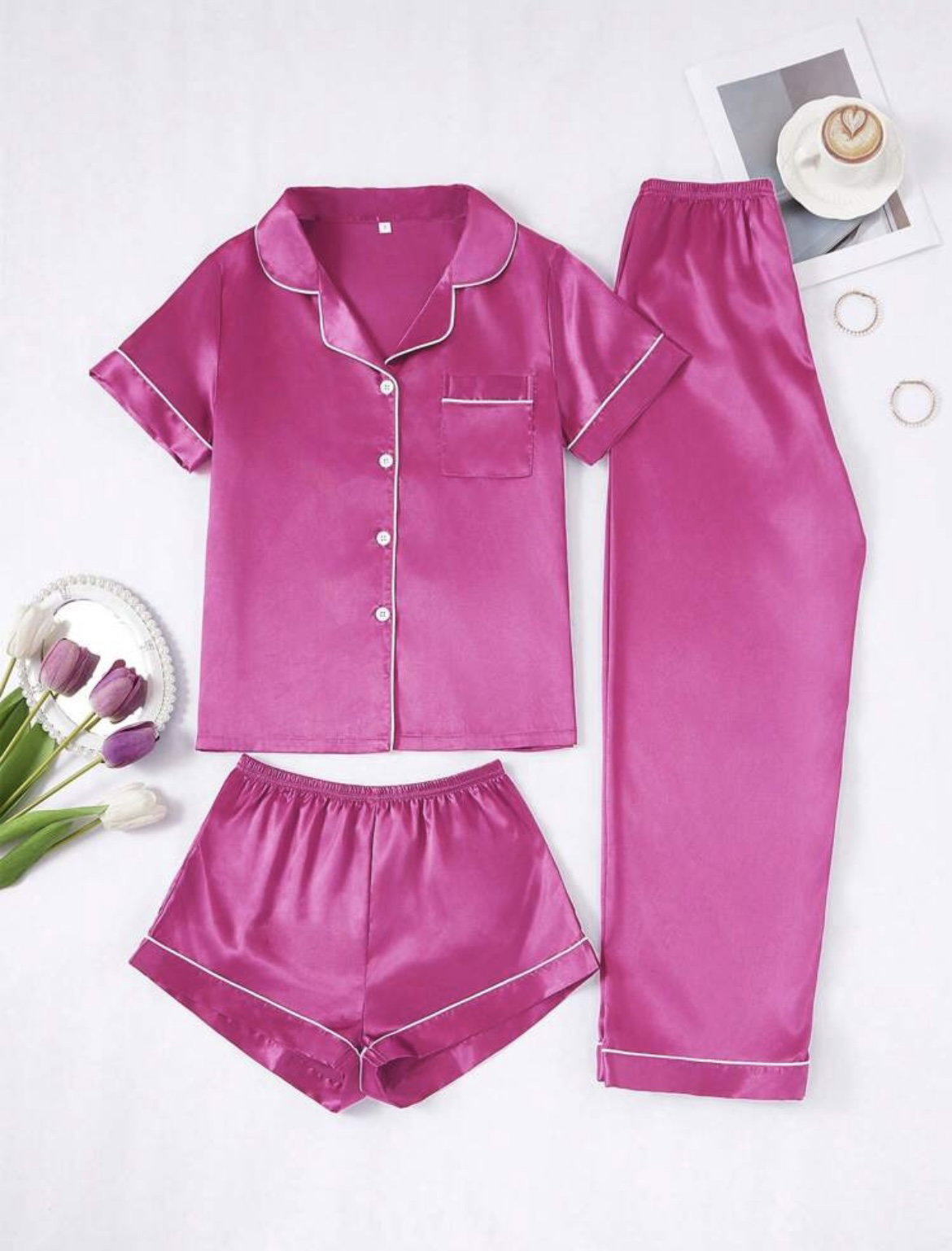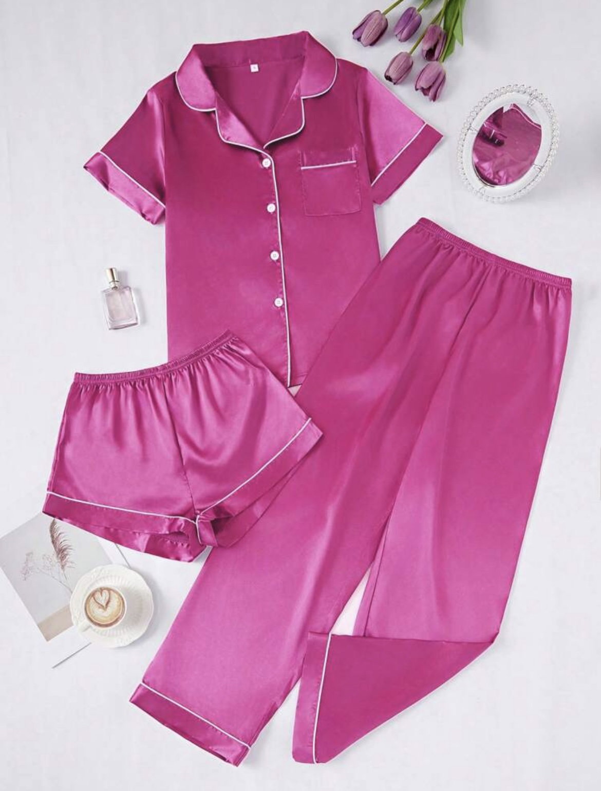 Pijama camisero importado de satén con camisa mangas cortas, short y pantalón.
