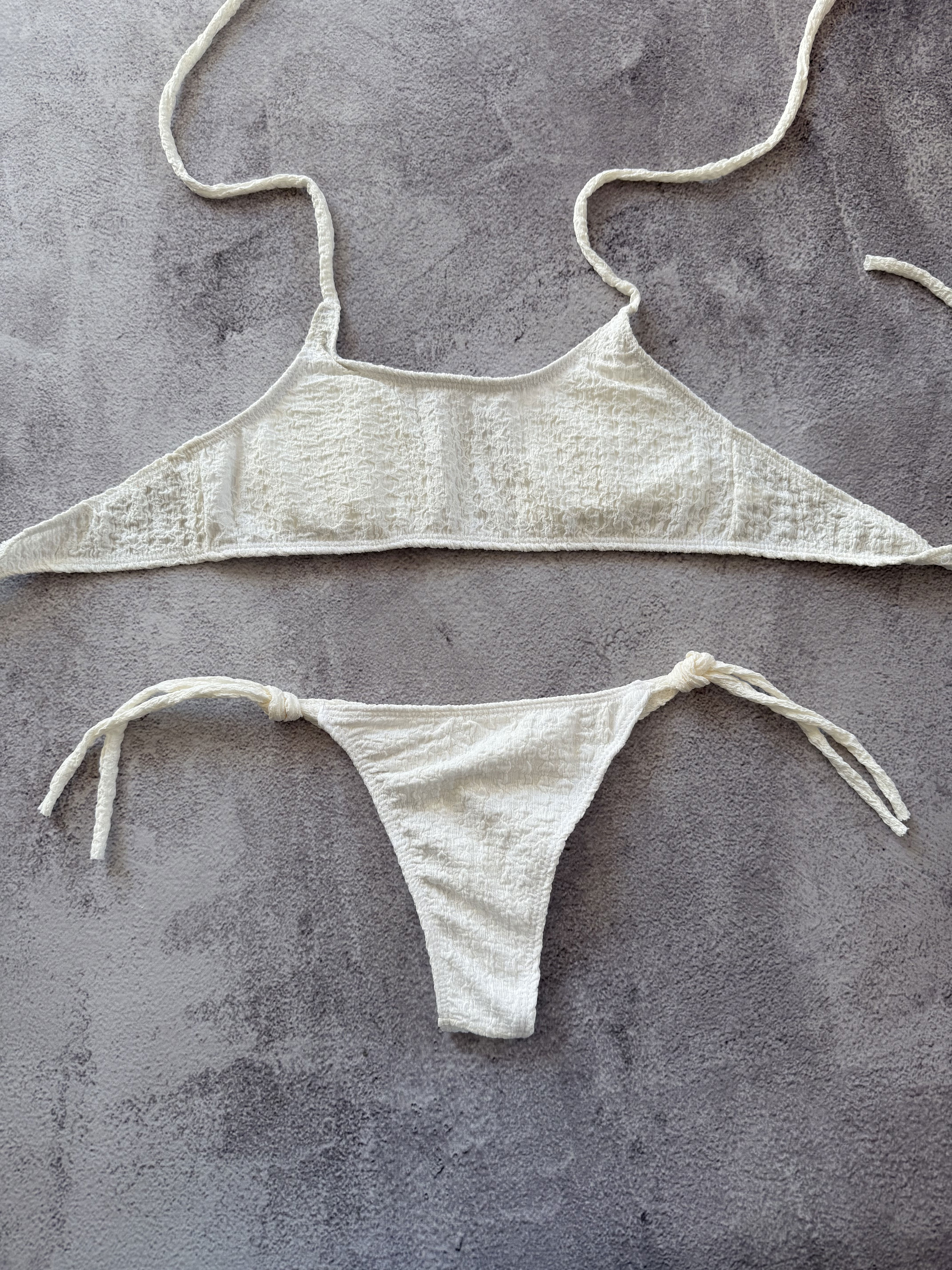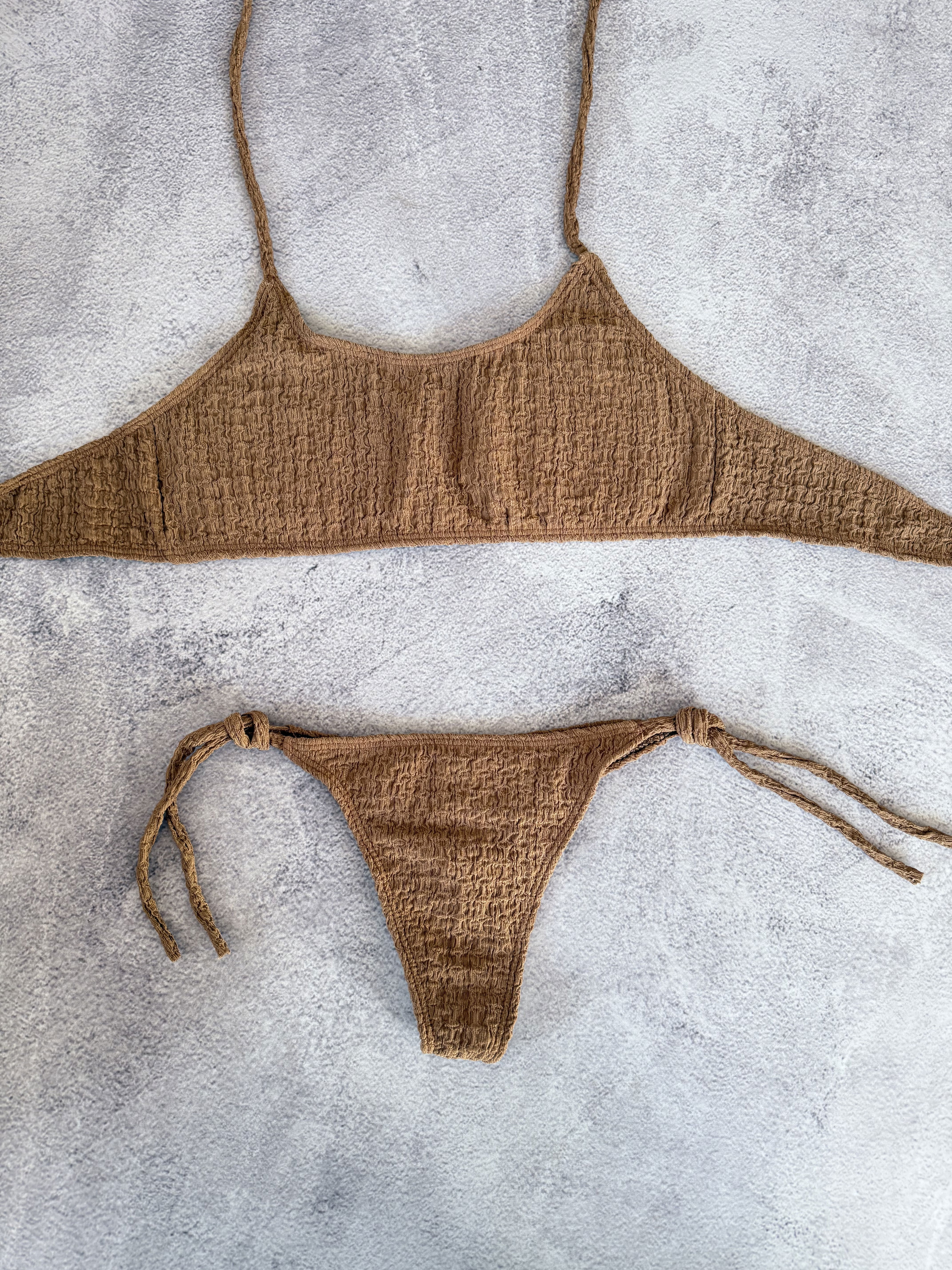 Bikini de bambula con corpiño tipo top para atar y bombi colaless para atar.