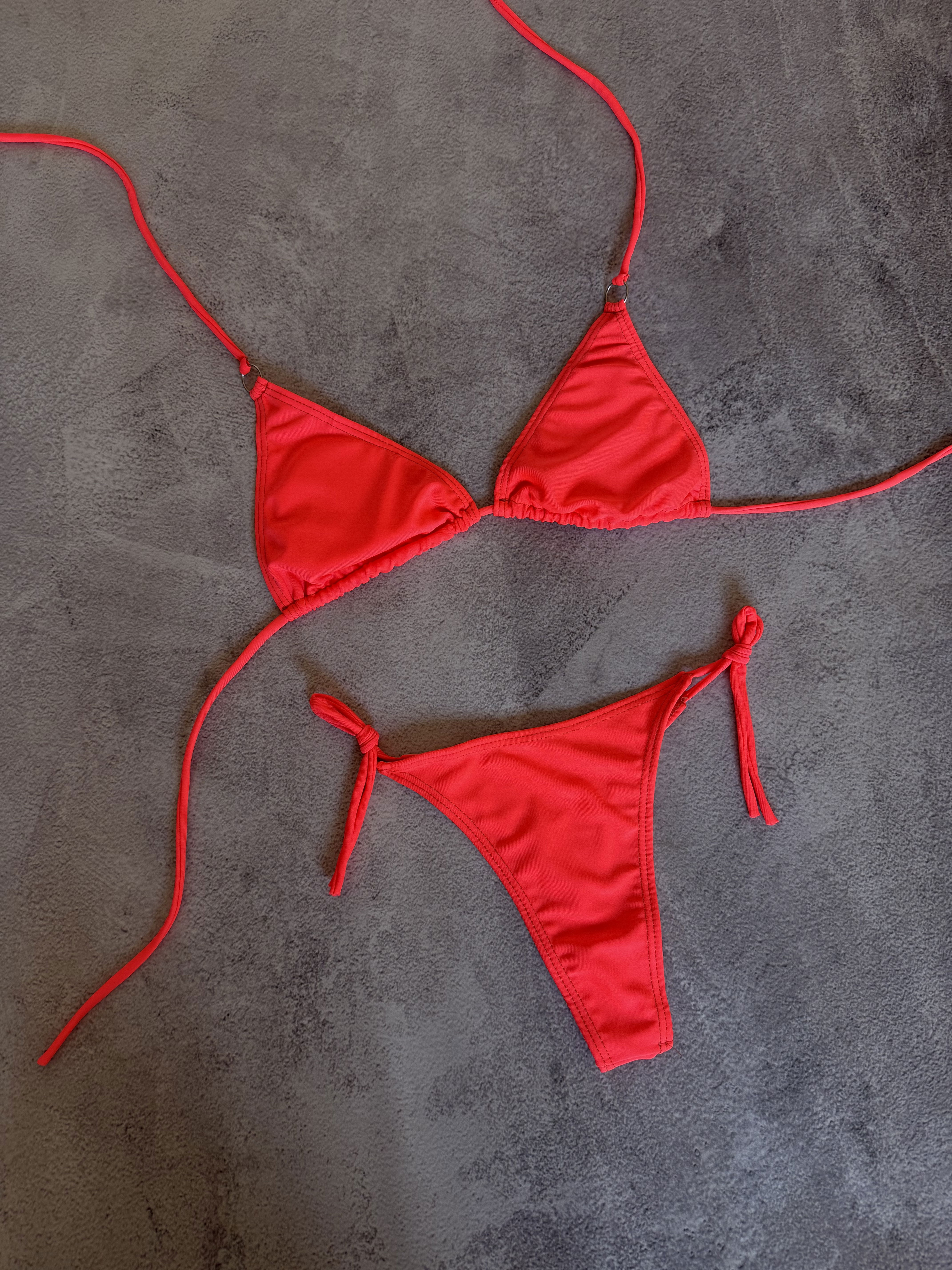 Bikini de tricot con corpiño triangulito con detalle de argolla superior y bombi colaless para atar.