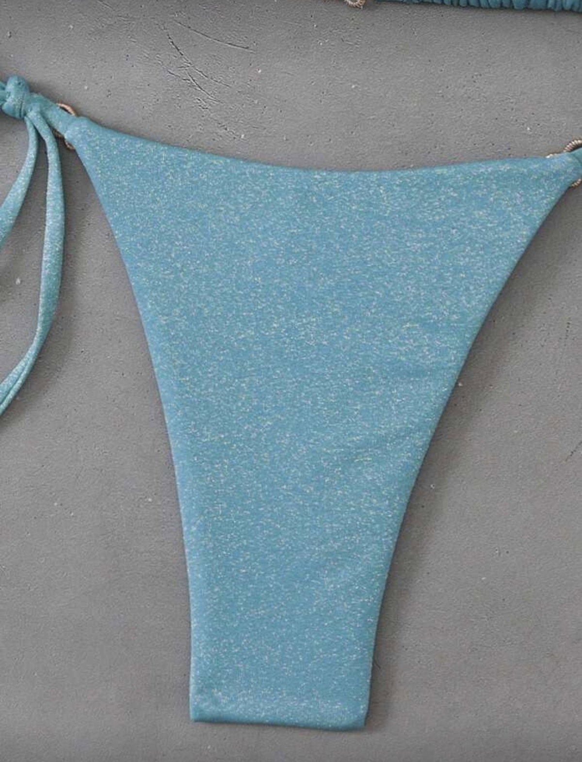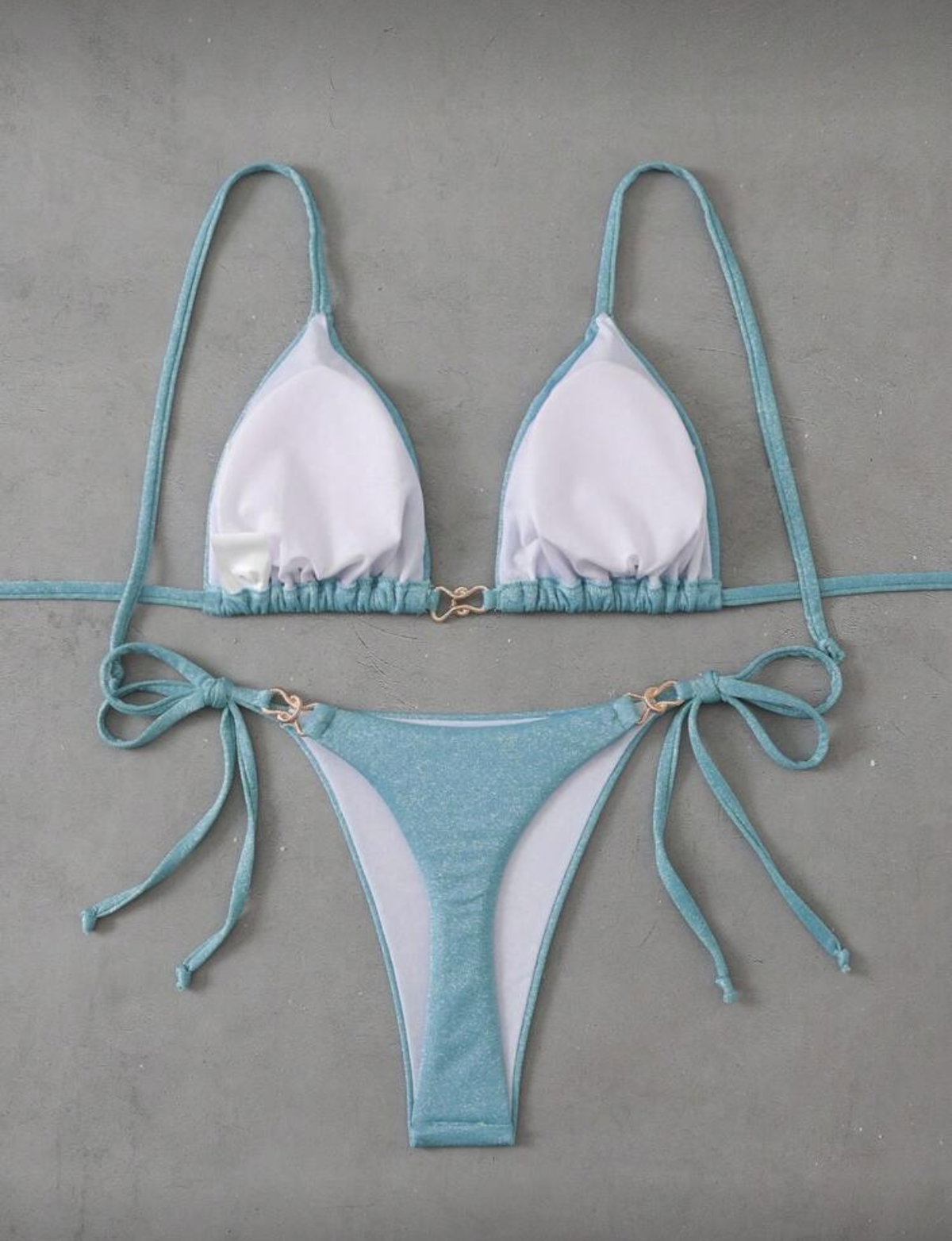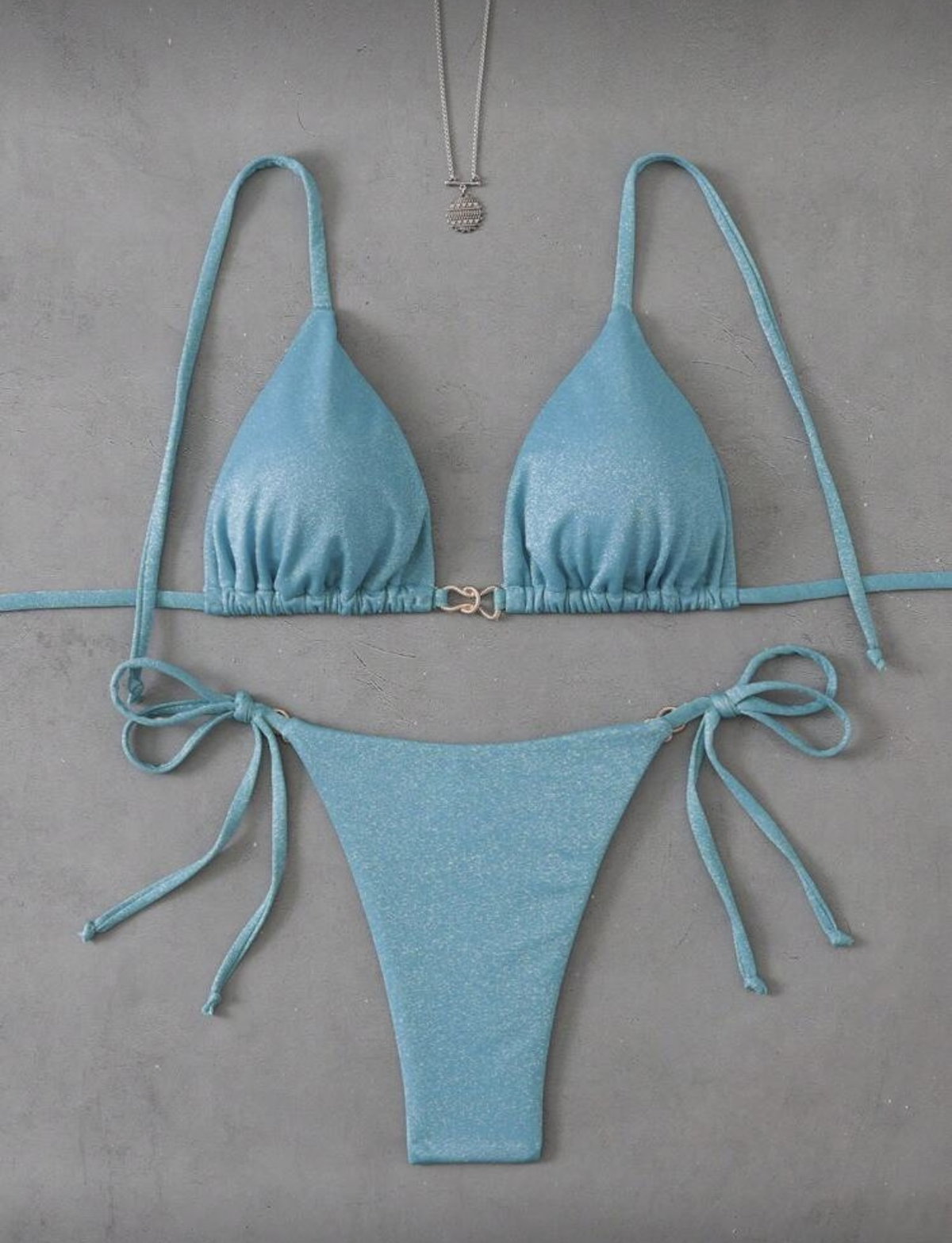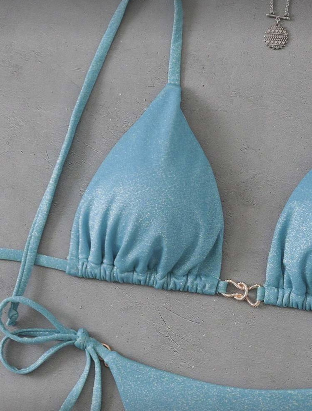 Bikini importada de lycra brillosa premium con avío de metal en el centro del corpiño.