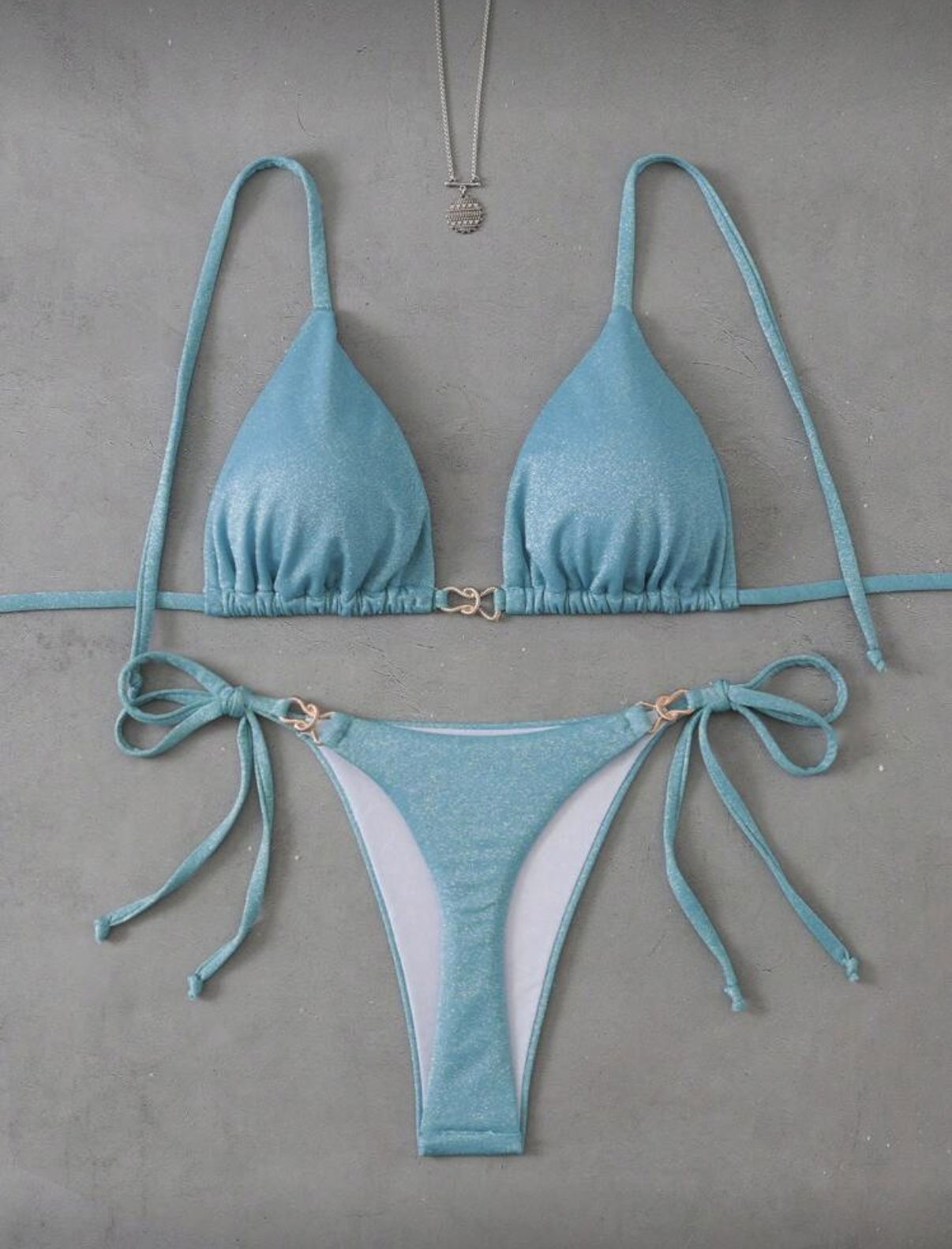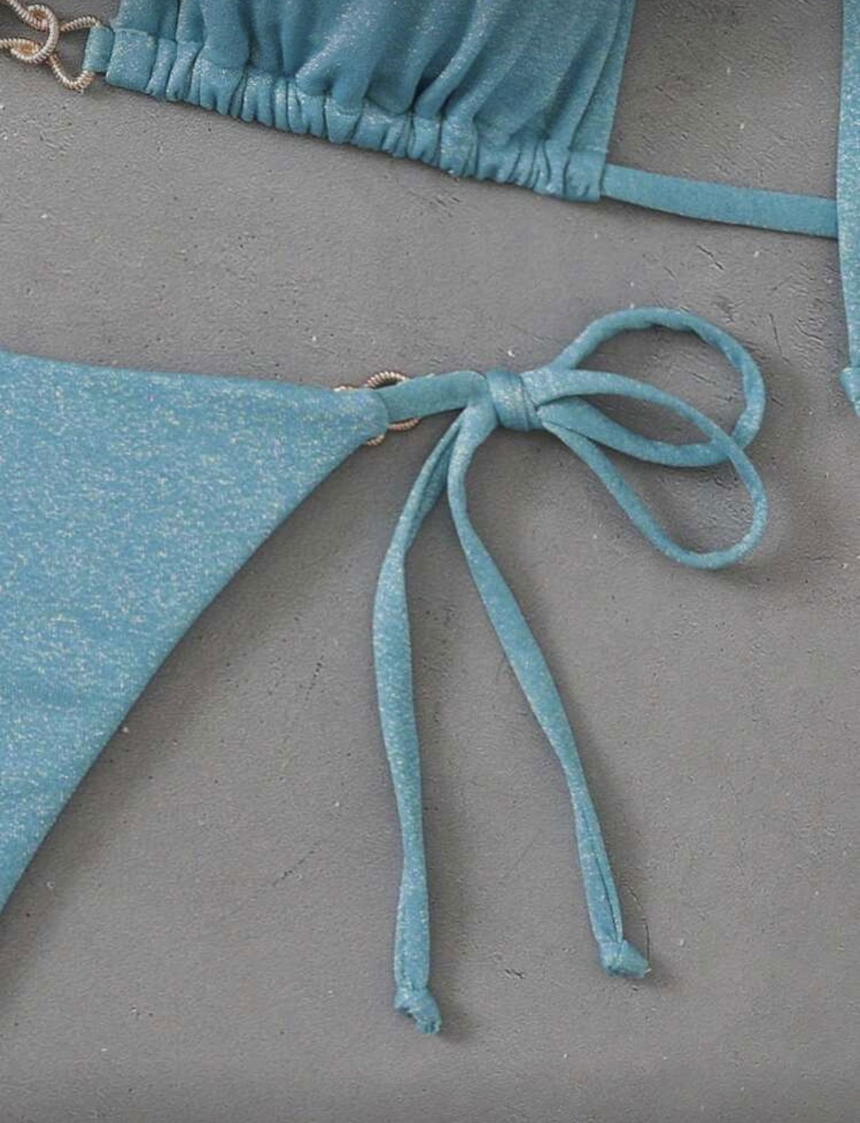 Bikini importada de lycra brillosa premium con avío de metal en el centro del corpiño.