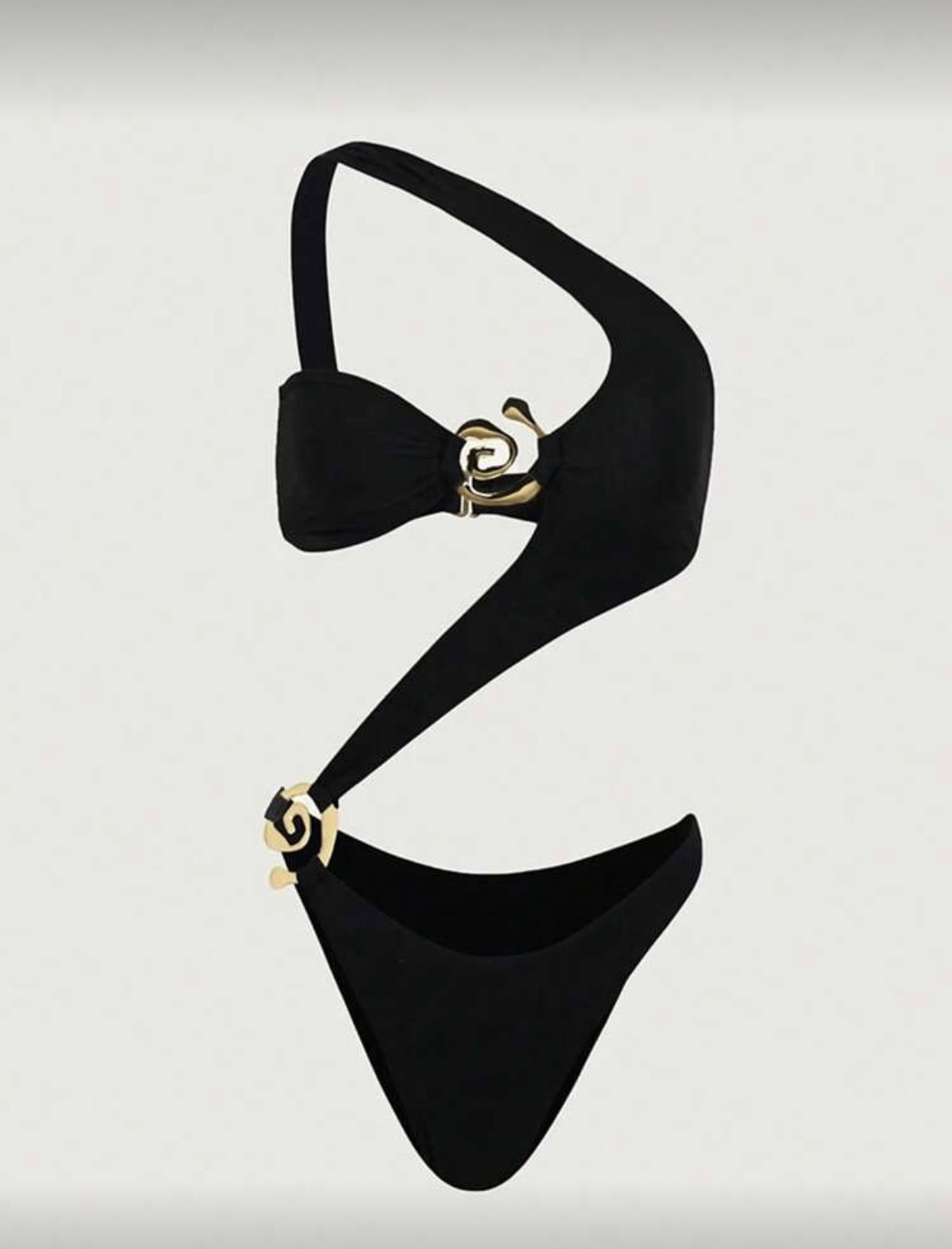 Trikini importada de lycra premium con avíos de metal de 8 cm en el centro de la parte superior y al costado de la bombacha.