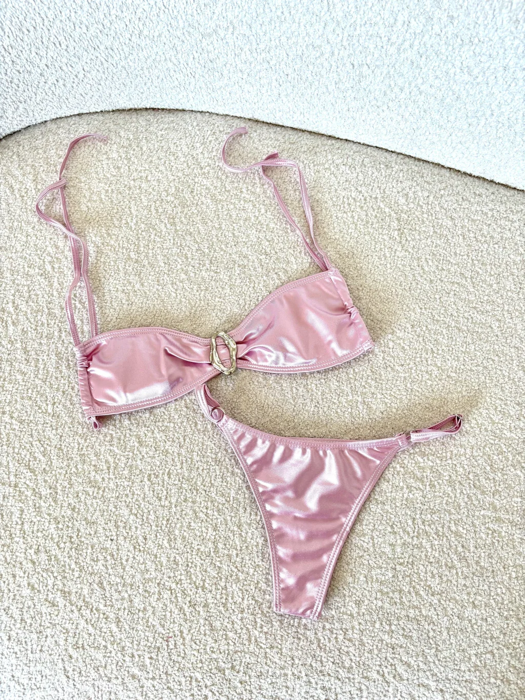 Bikini de tricot brilloso con avío central en el corpiño, se ata en la espalda. Bombi colaless regulable.