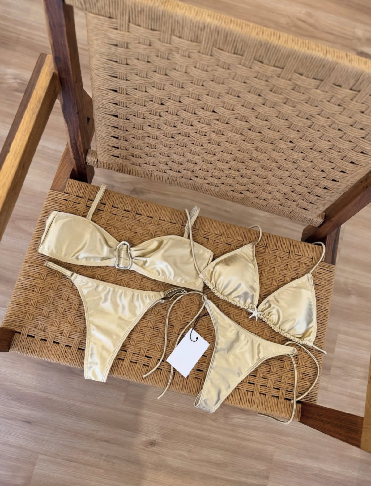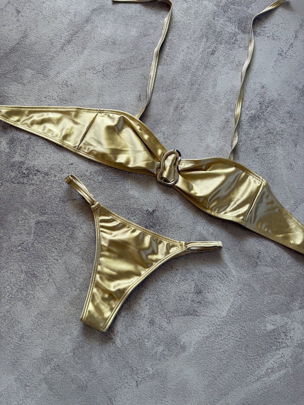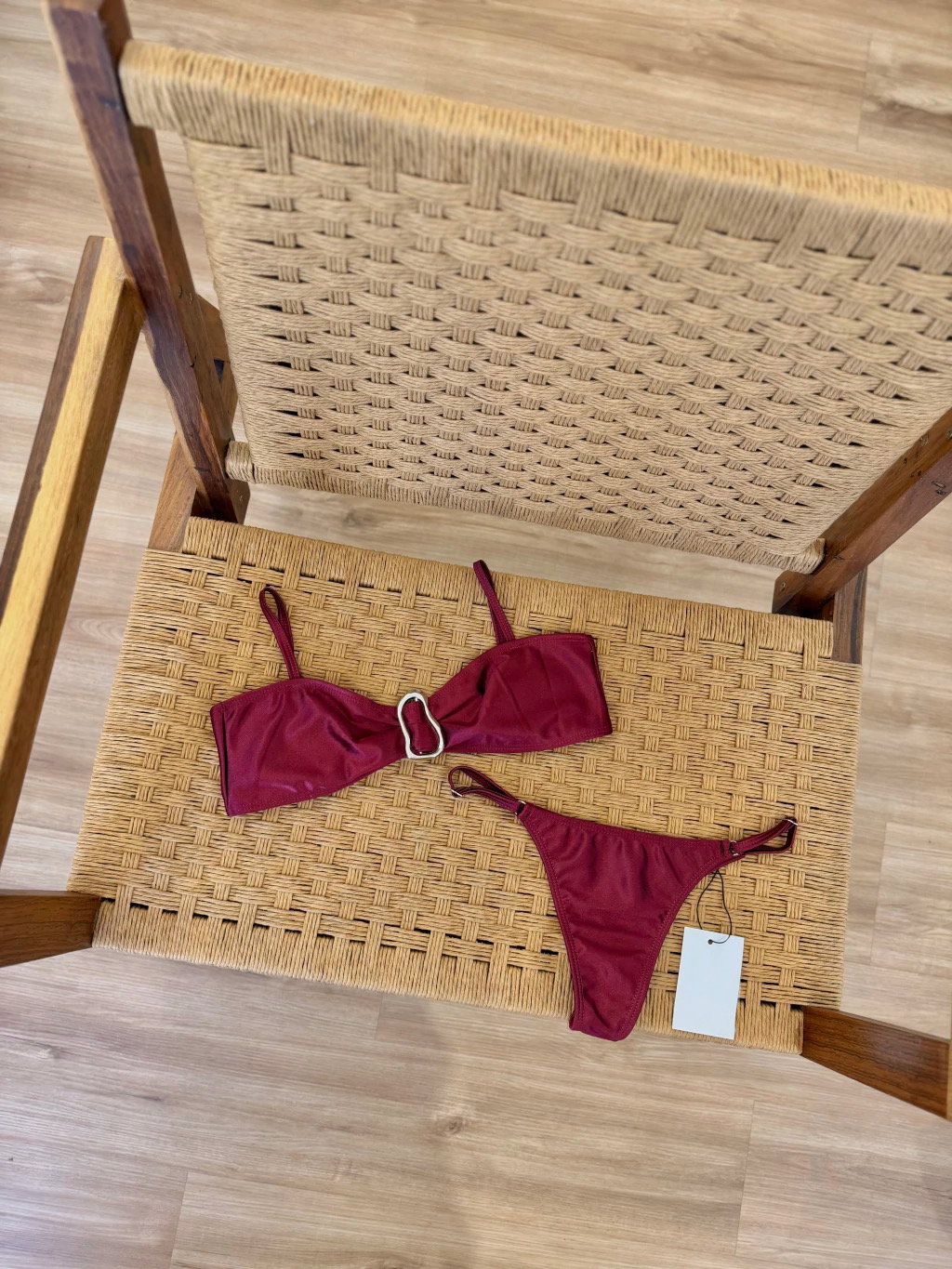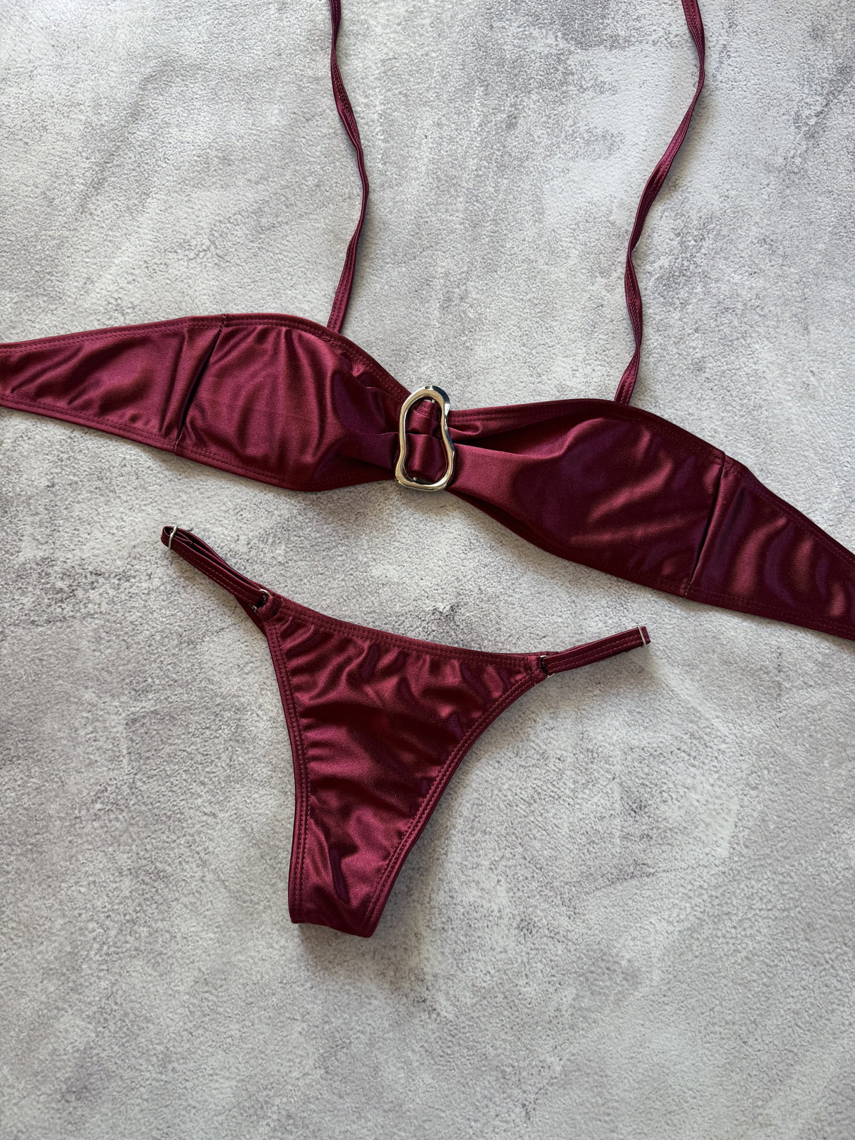 Bikini de tricot brilloso con avío en el centro del corpiño. La parte superior tiene un cierre con broche en la espalda y la bombi es colaless regulable.r