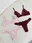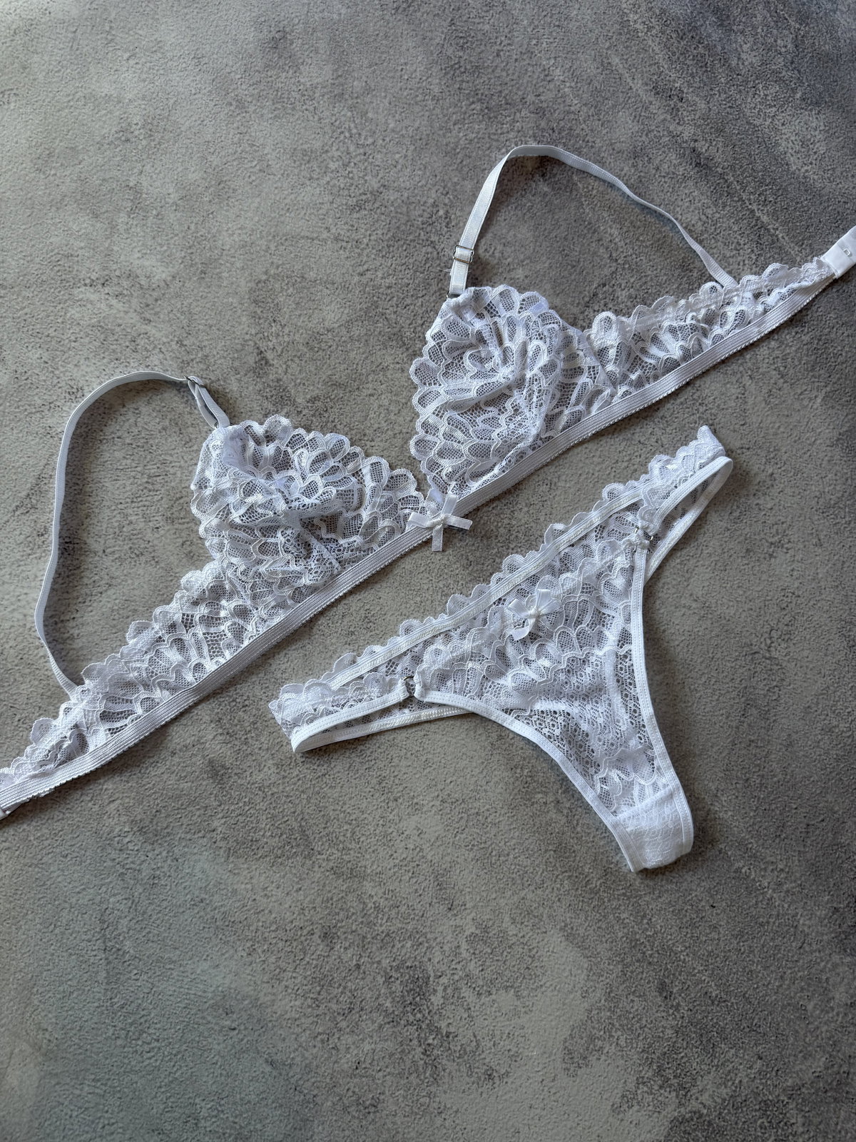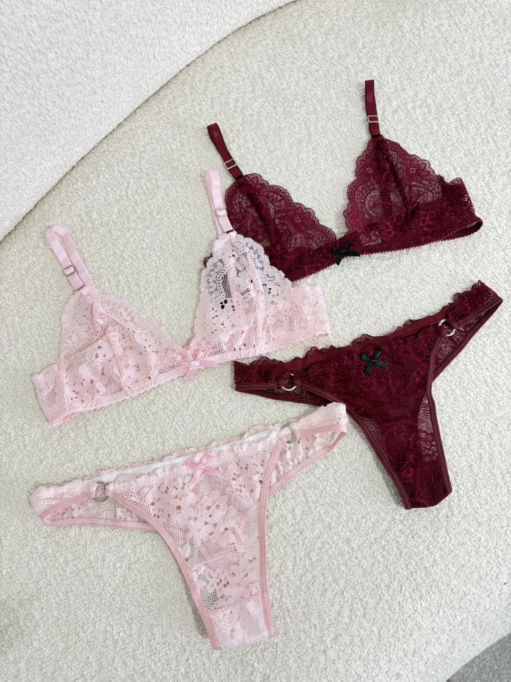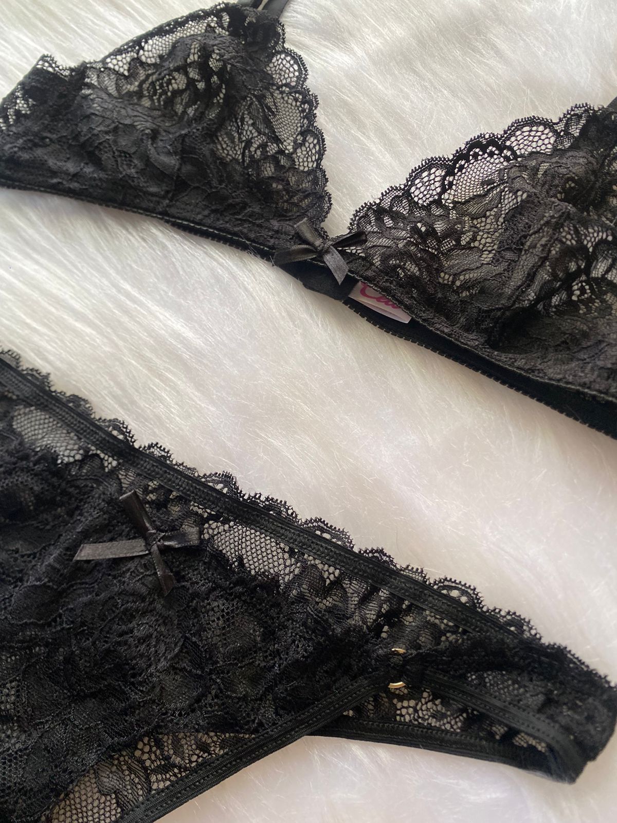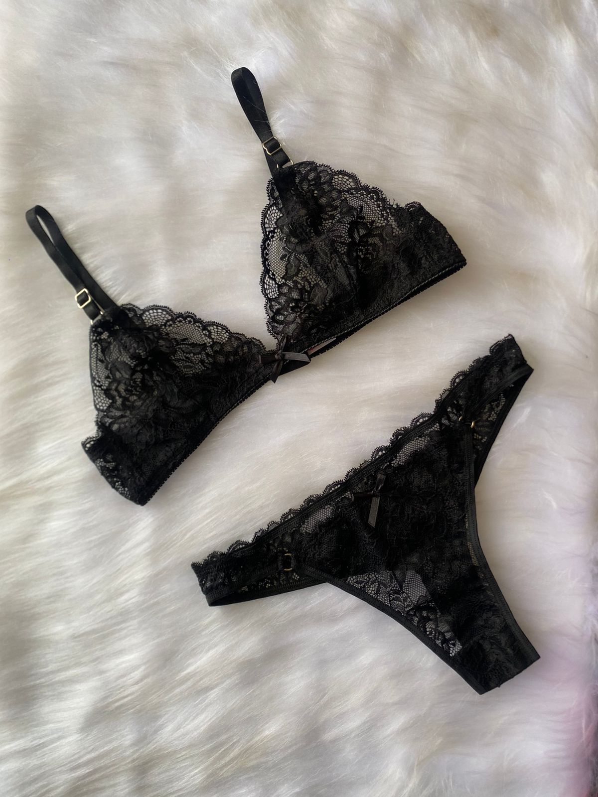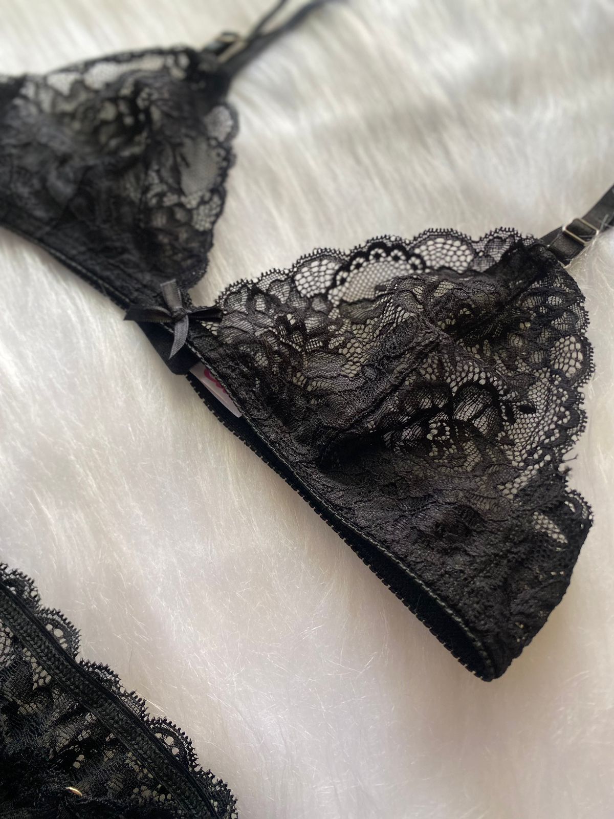 Conjunto de encaje con corpiño bralette y bombi colaless completa con detalle de argollas a los costados.