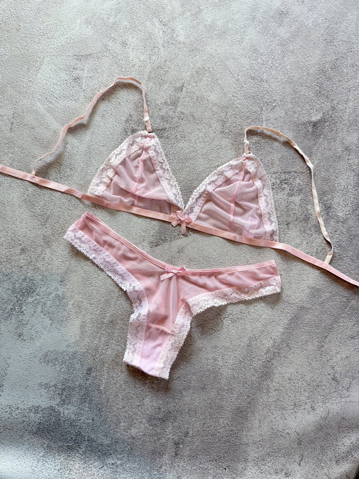 Conjunto de microtul con detalles de puntilla, corpiño bralette con bombi colaless completa.