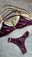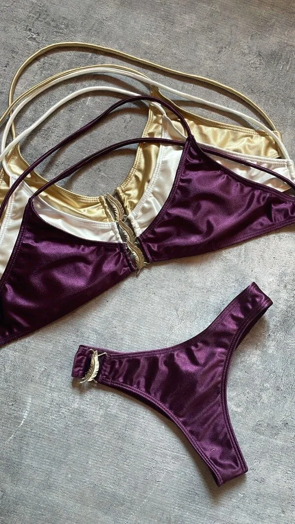 Bikini de tricot brilloso con corpiño tipo top con avío central y bombi colaless completa con avío lateral.