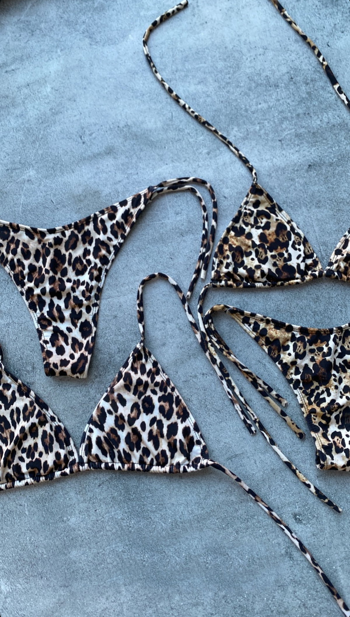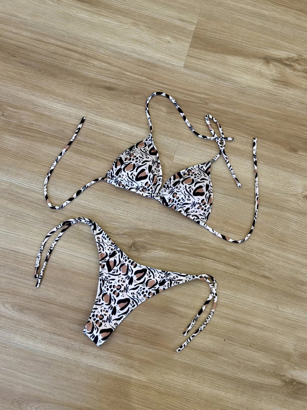 Bikini de lycra con estampa animal print con corpiño tipo triangulito y bombi colaless para atar.