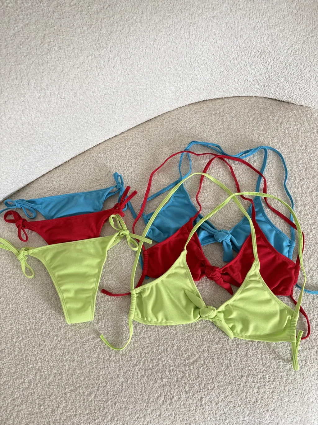 Bikini con corpiño tipo top con moño central y bombi colaless para atar.