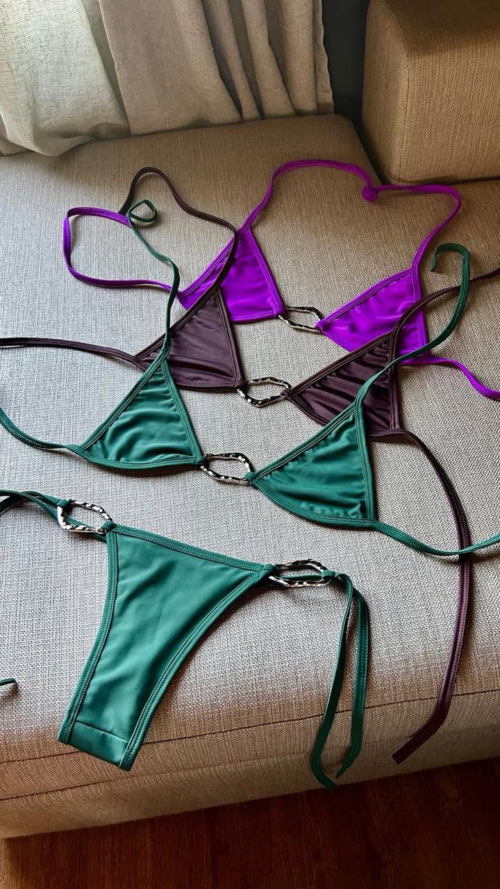 Bikini de tricot premium con corpiño tipo triangulito con avío central y bombi colaless para atar con avíos en los laterales.