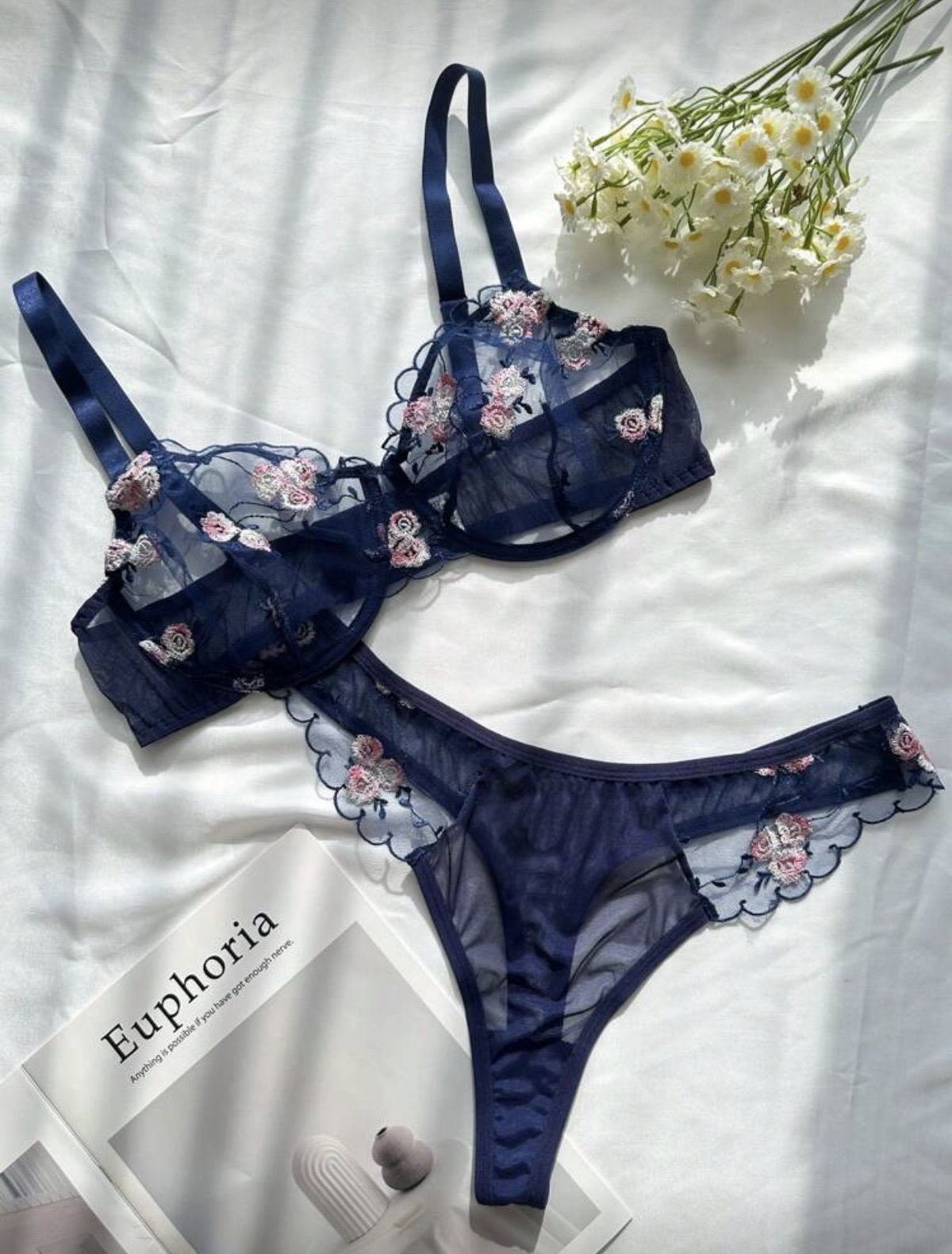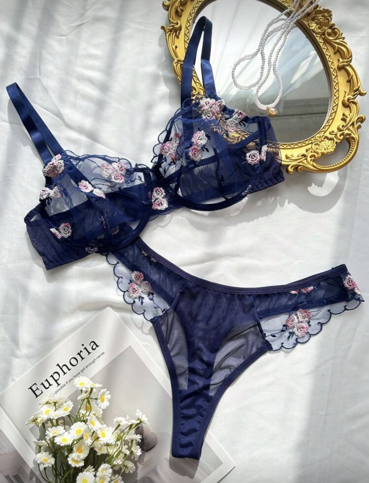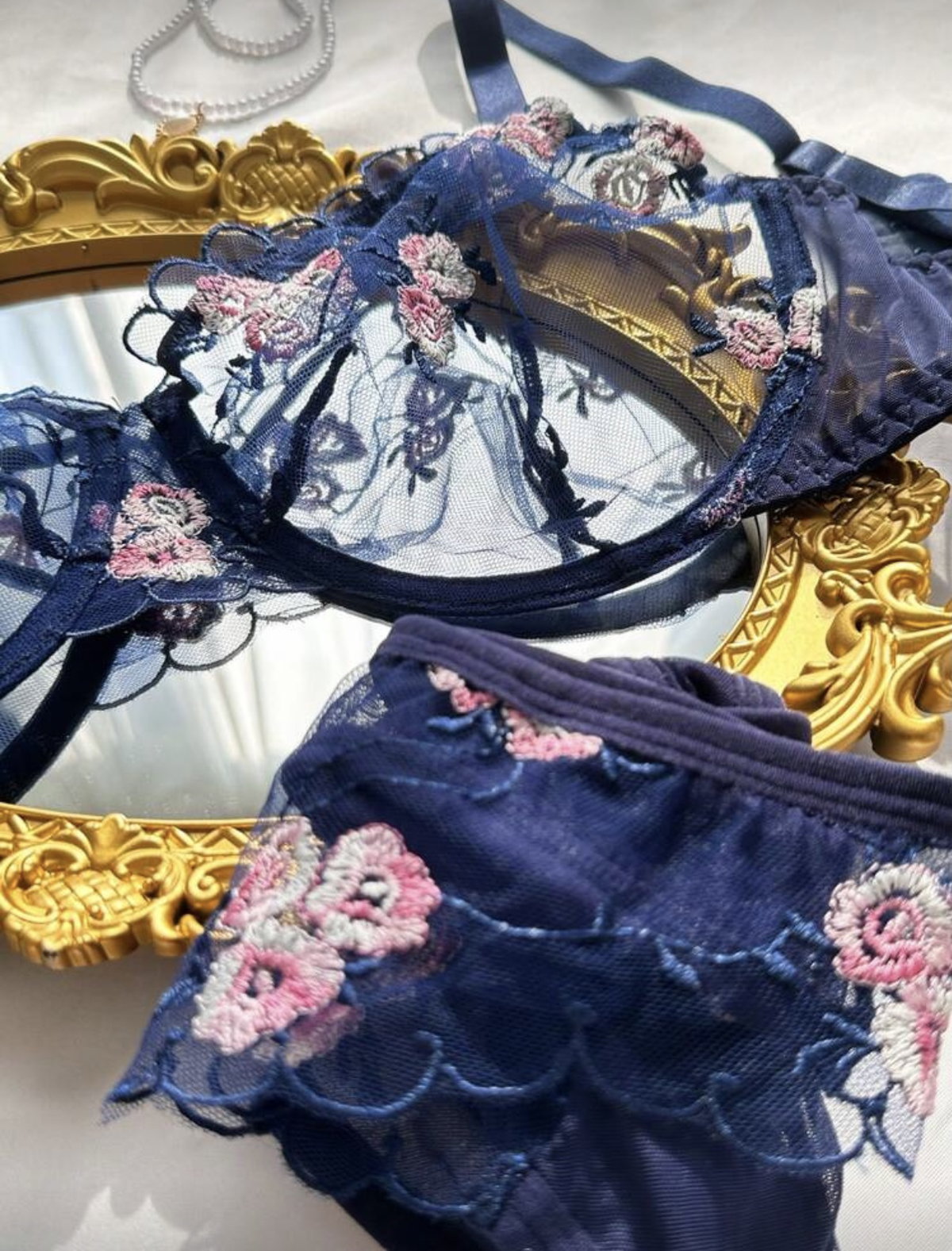 Set de lencería importado con corpiño balconette de microtul bordado con bombi colaless completa.