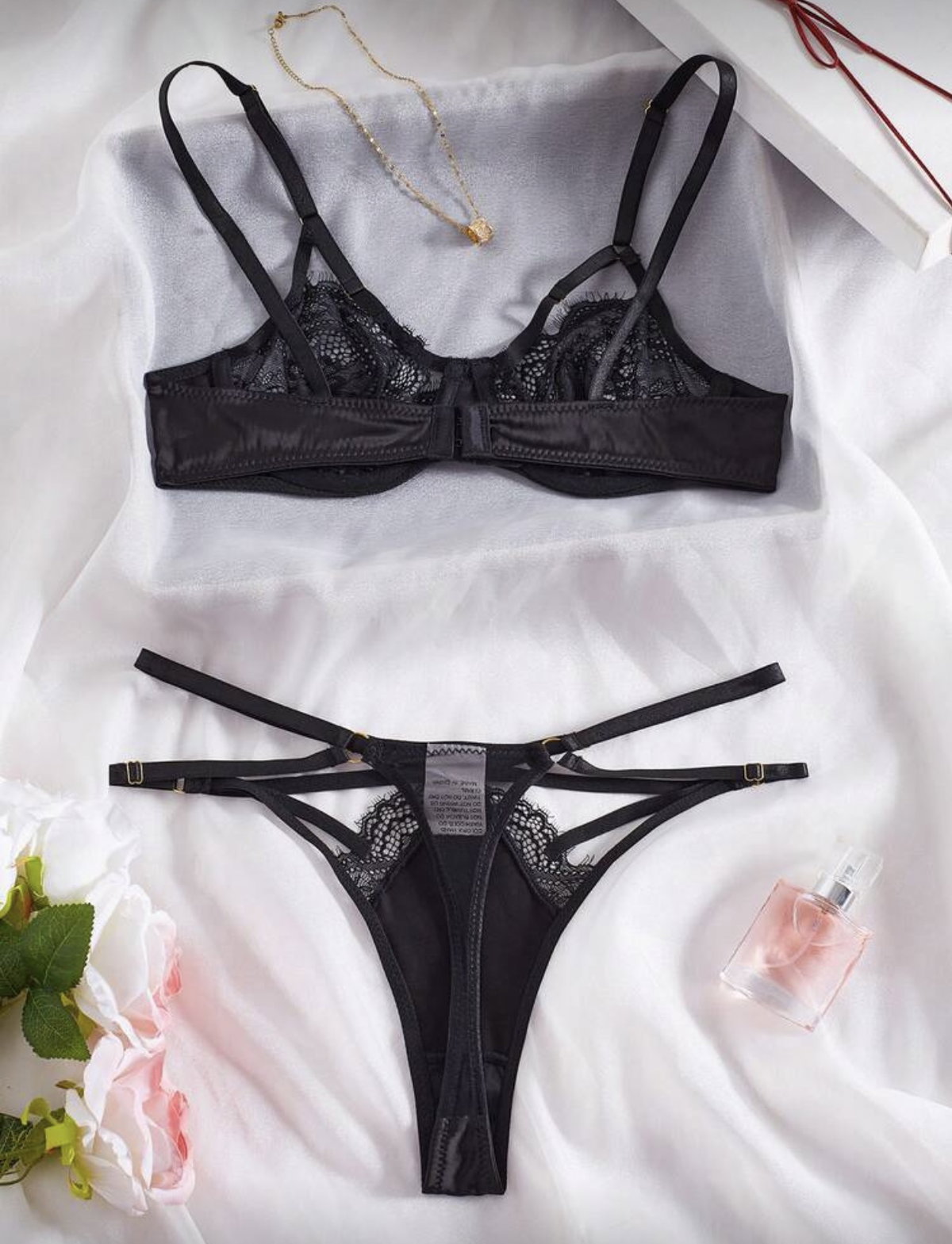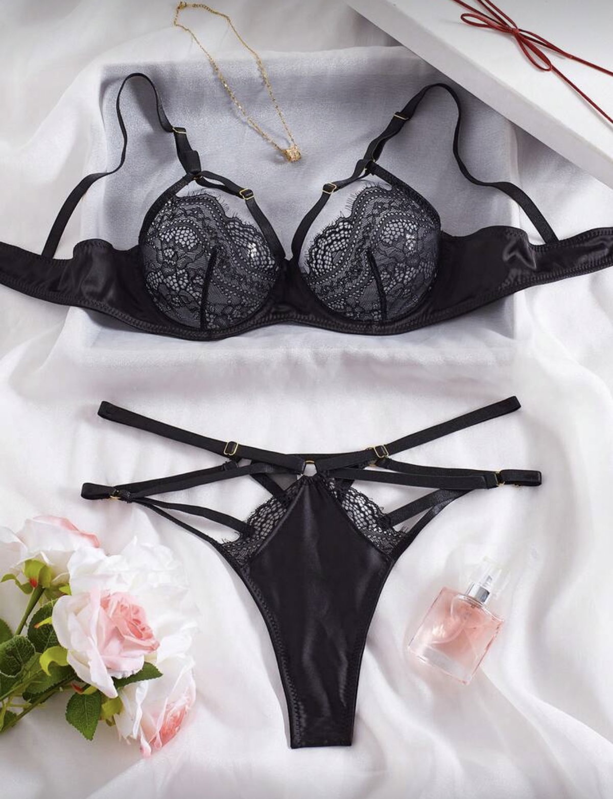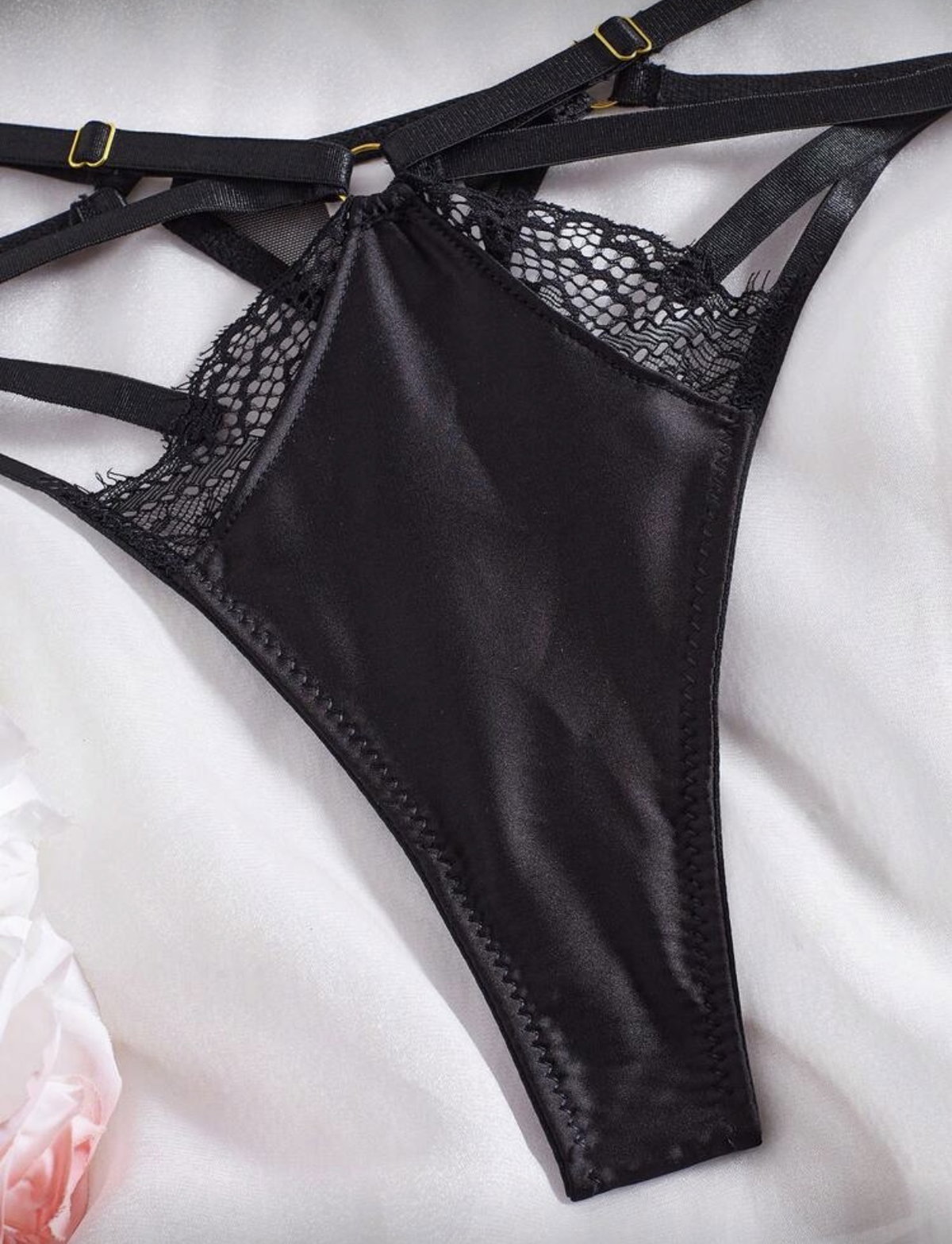 Set de lencería importado con corpiño balconette de satén con encaje y reguladores superiores, y bombi colaless regulable con doble ajuste.