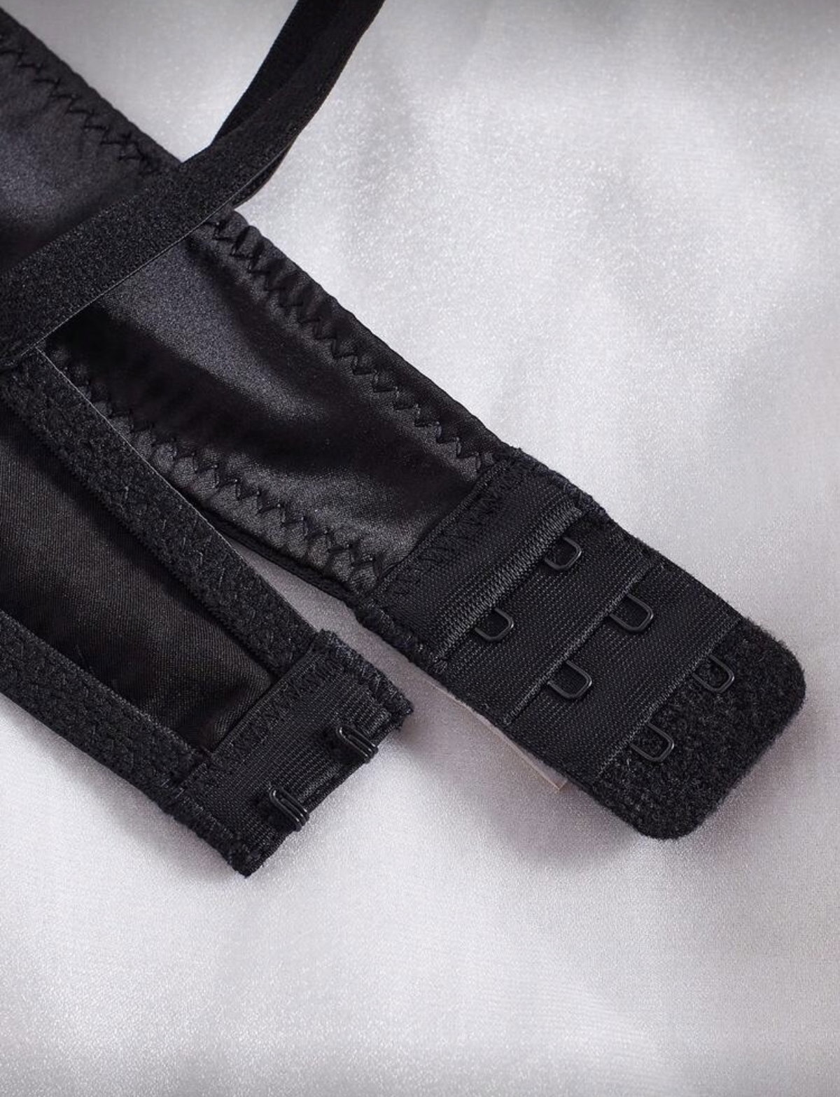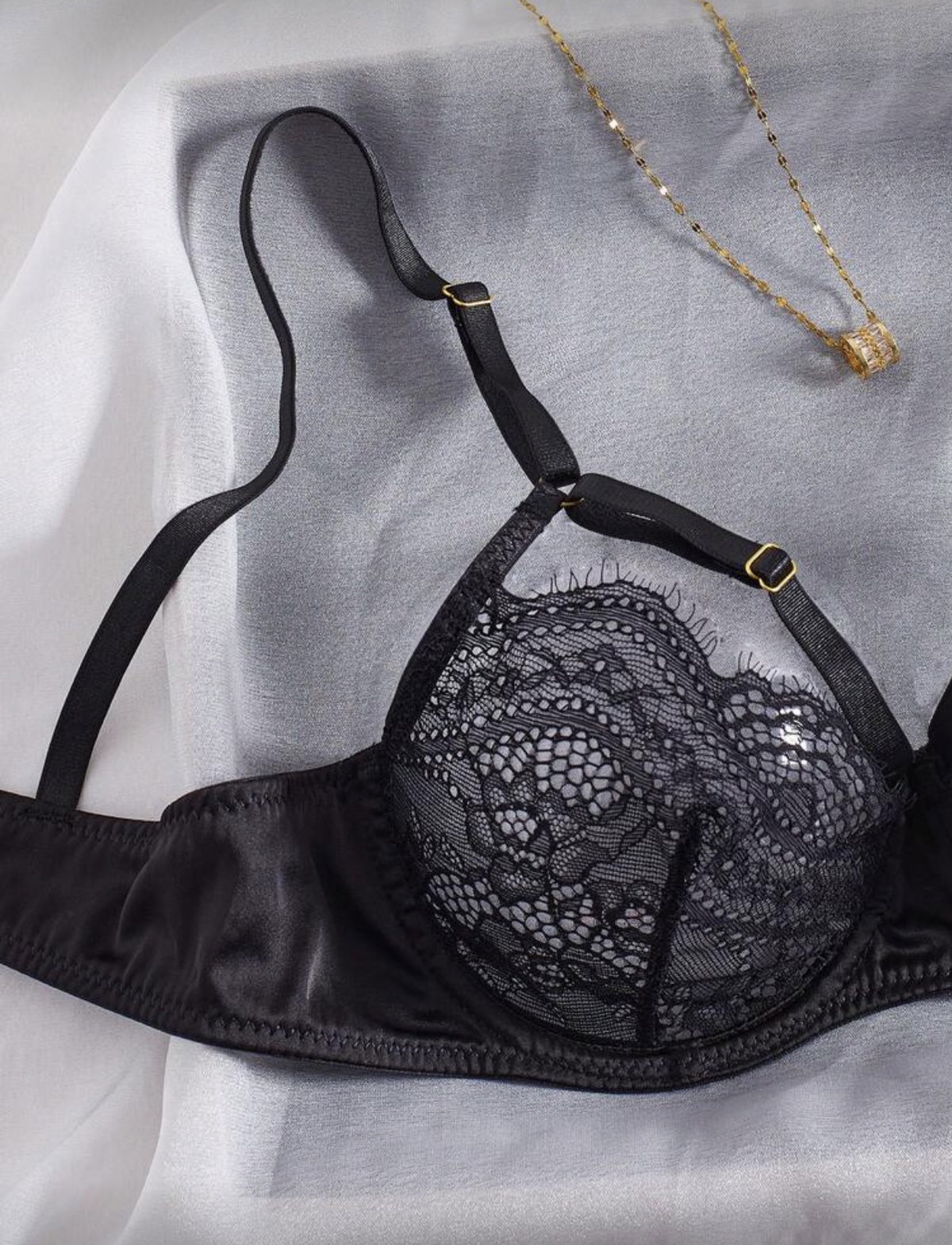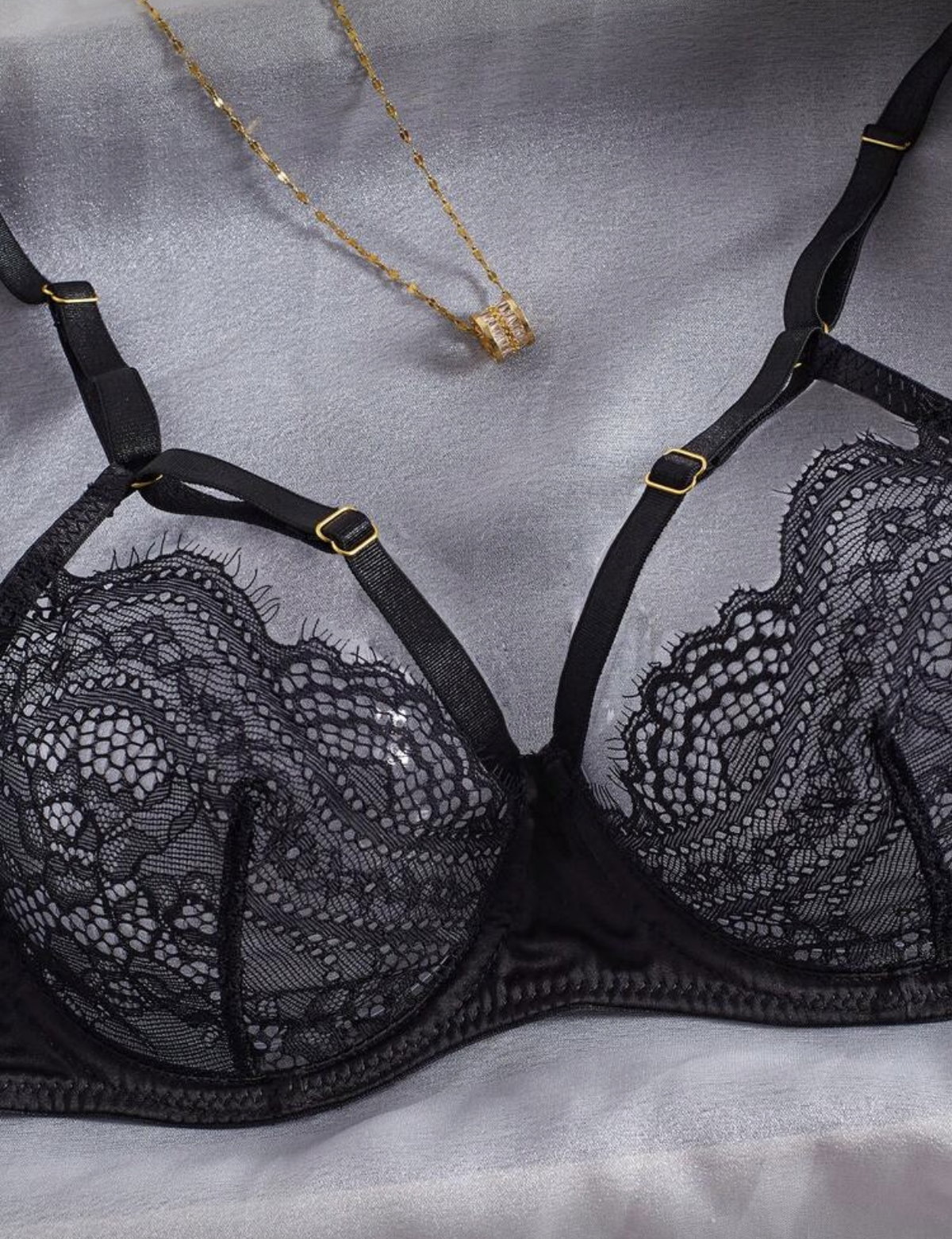 Set de lencería importado con corpiño balconette de satén con encaje y reguladores superiores, y bombi colaless regulable con doble ajuste.