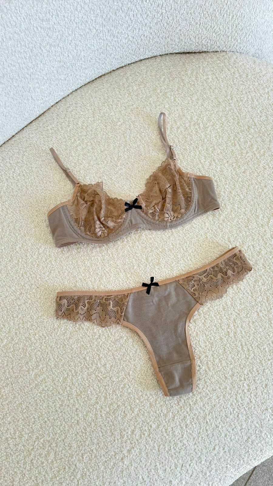Conjunto de algodón con encaje y arco en el busto, una combinación de comfy y sexy! La bombi es una colaless completa también de algodón con detalles de encaje. La confección de este modelo es pequeña, si estas entre 2 talles recomendamos pedir el más grande de ambos.