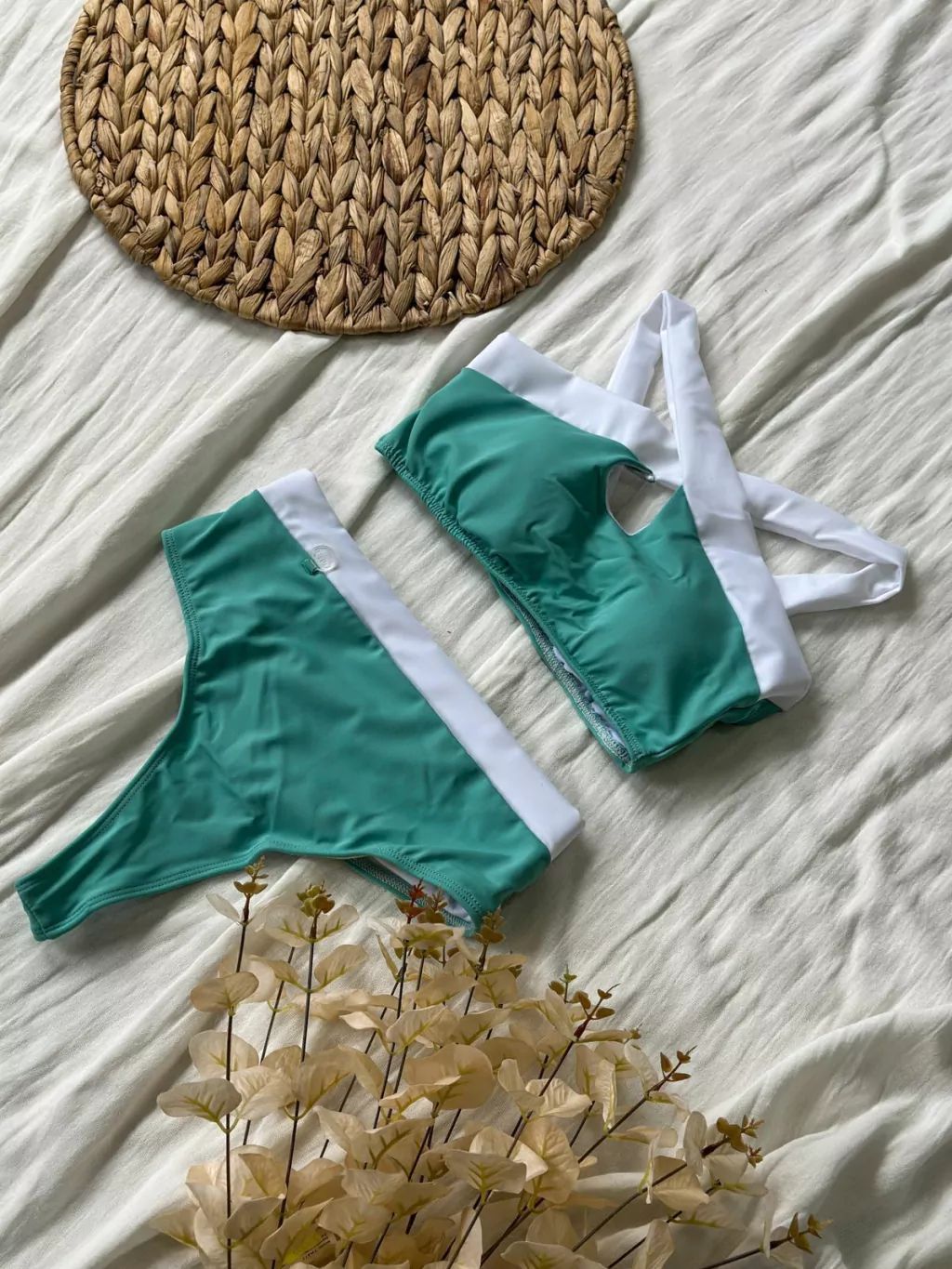 Bikini de lycra estilo top con cuello halter, bombi colaless tiro alto. El corpiño tiene taza desmontable.