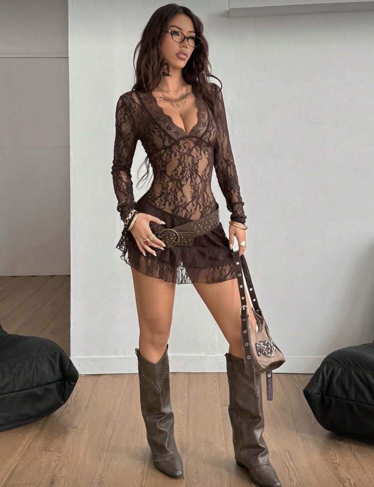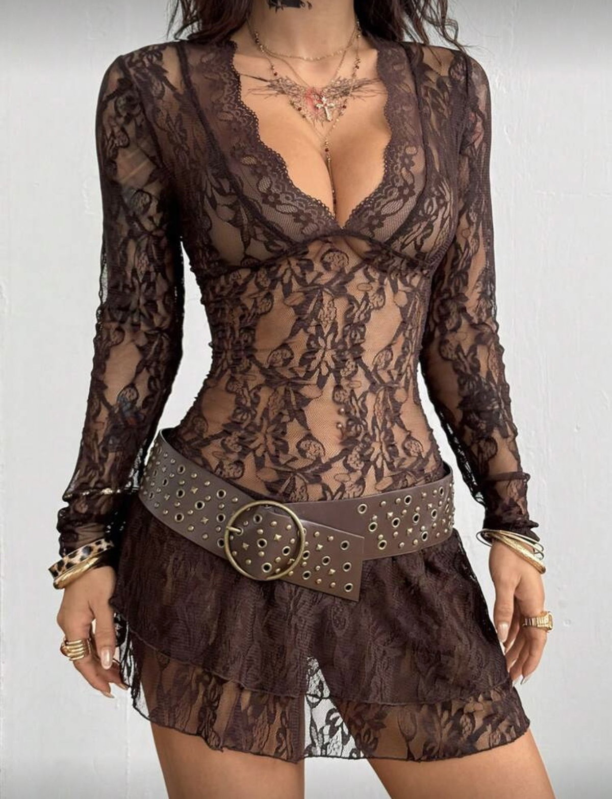 Vestido de encaje importado con mangas largas y escote en V, transparente. Es super elastizado, recomendamos pedir un talle menos del que normalmente usassi querés que se ajuste bien al cuerpo!